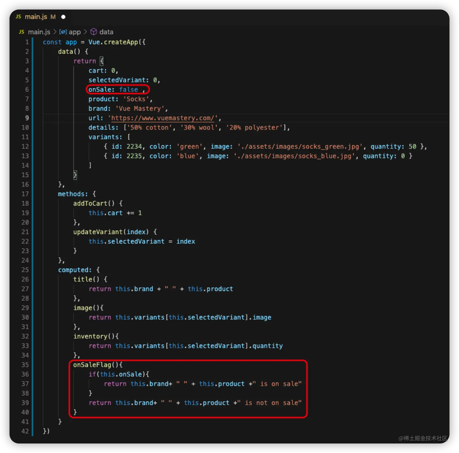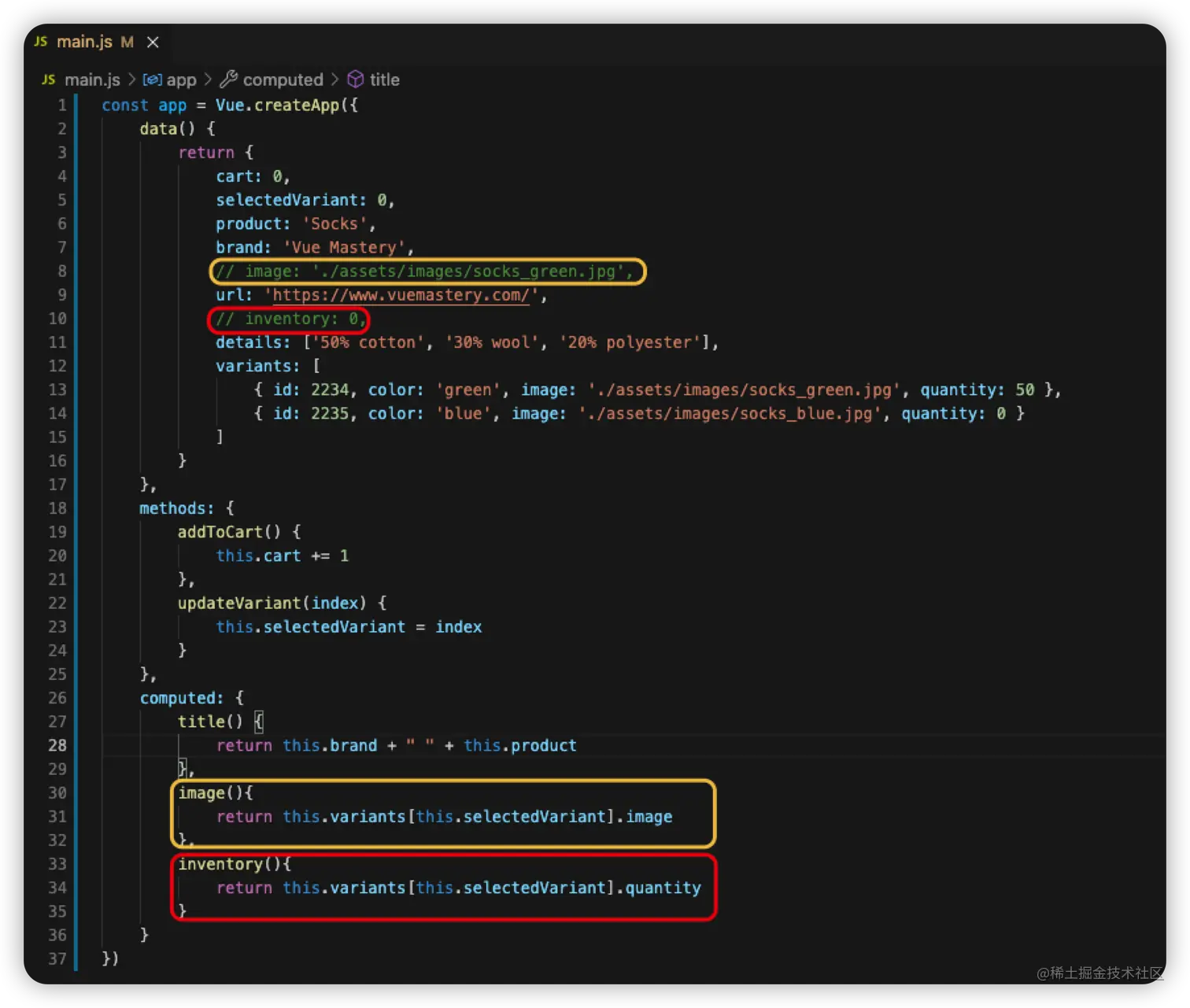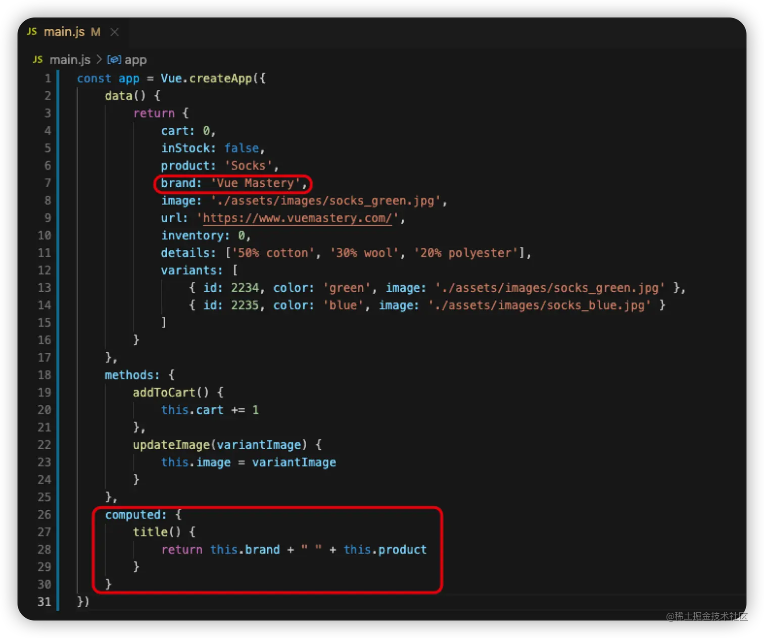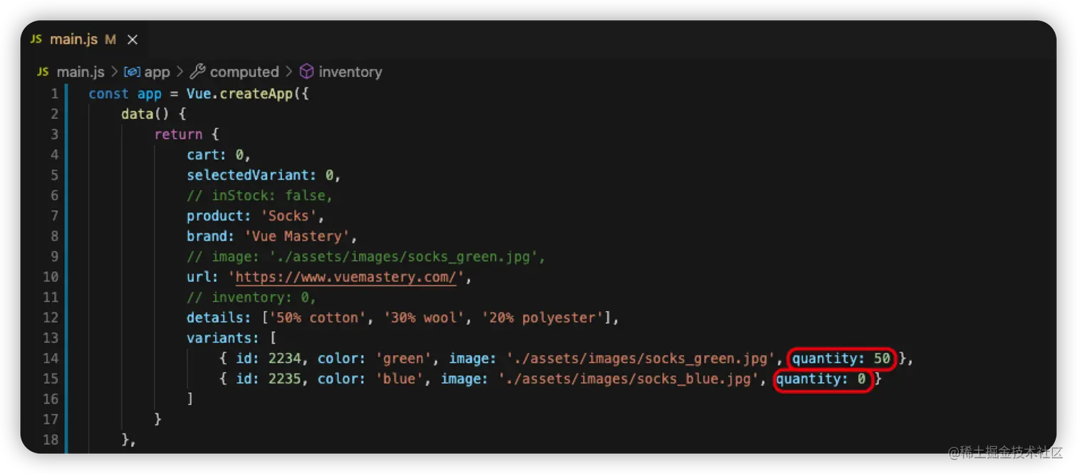 - 在main.js文件中添加变量和计算方法
