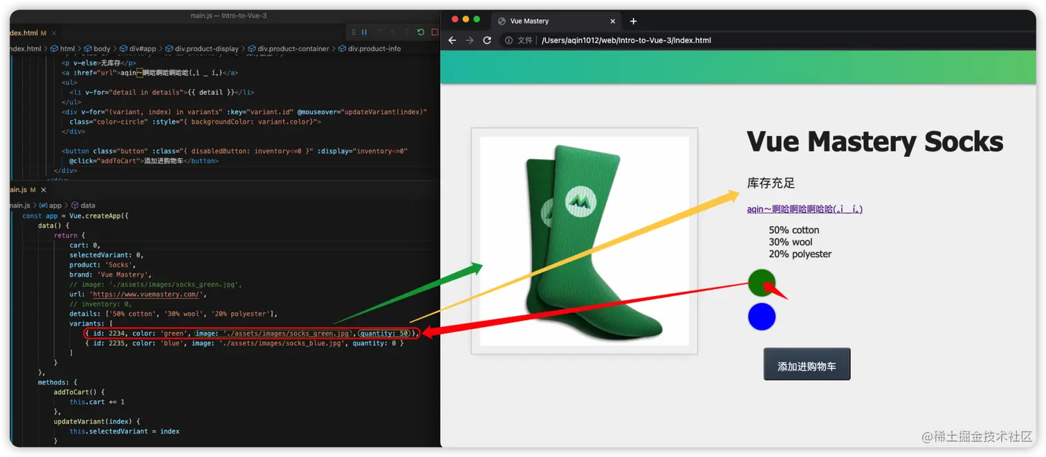 我们需要根据用户鼠标移动的位置(绿圈圈/蓝圈圈,这里引入了序号0和1来分别代表绿色和蓝色)来判断用户想要获取哪个颜色的产品信息,然后根据获取到的产品信息来显示产品图片、判断产品库存、进而判断出是显示“库存充足/库存紧张/无库存”,再进一步判断出按钮的显示样式(是否可点击)等