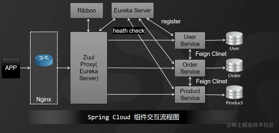 而Spring Cloud所有请求都统一通过 API 网关(Zuul)来访问内部服务。网关接收到请求后,从注册中心(Eureka)获取可用服务。由 Ribbon 进行均衡负载后,分发到后端的具体实例。微服务之间通过 Feign 进行通信处理业务。