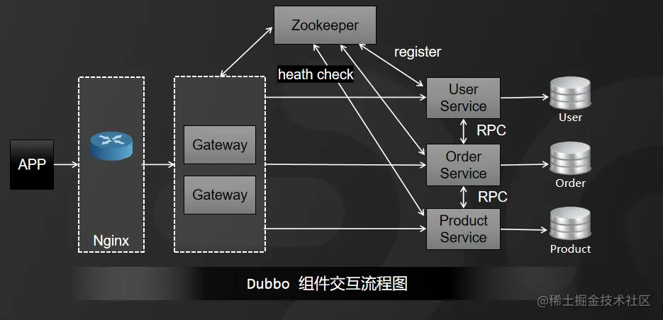 Dubbo的每个组件都是需要部署在单独的服务器上, 用来接收前端请求、聚合服务,并批量调用后台原子服务。每个Service层和单独的DB交互。