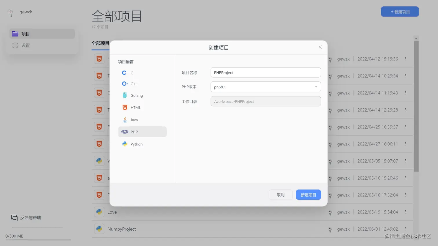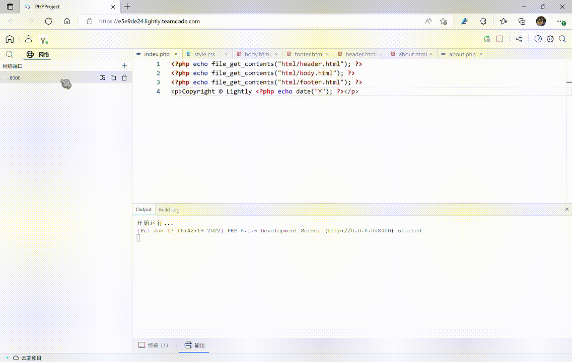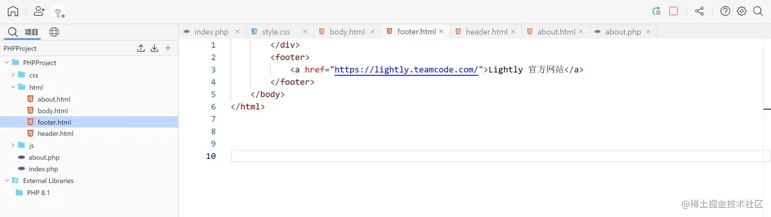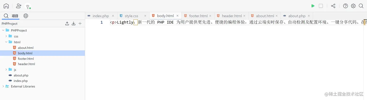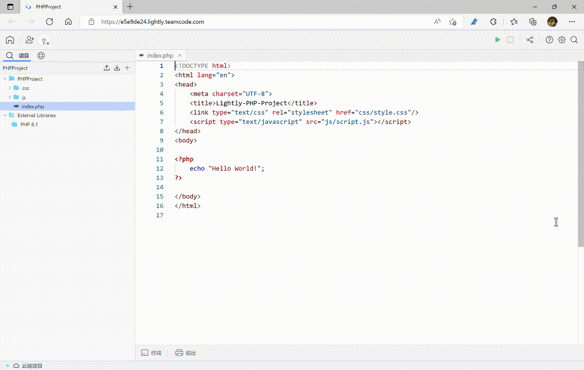 借助 Lightly 的自动配置环境功能,大家只需在新建项目后,填写项目名称并选择 PHP 版本,即可快速开始在线编写 PHP 网页。