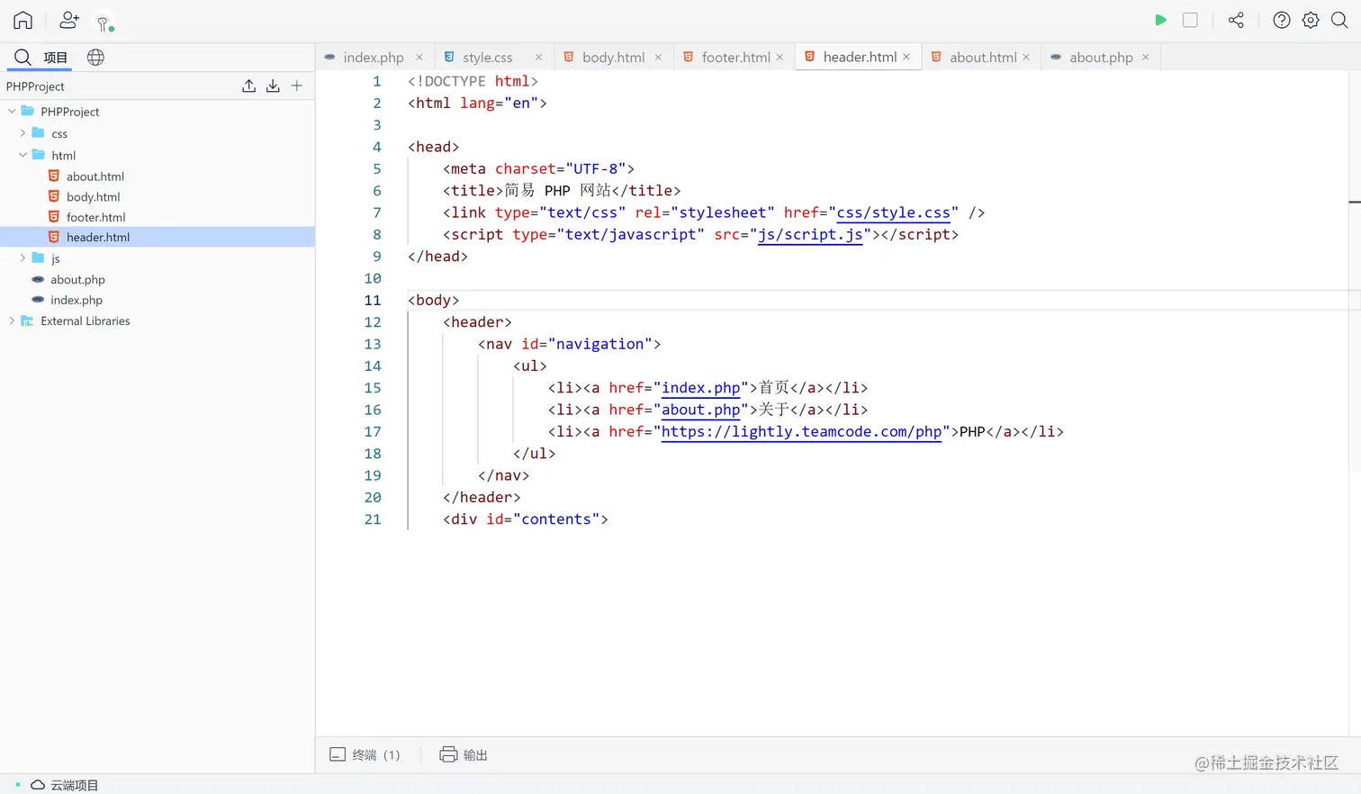 首先,我们将创建一个名为 header.html 的文件并添加所需的 HTML 头部信息。这篇教程已提前完成 CSS 部分,有兴趣的同学可以直接查看完整代码获取 CSS 文件:9213bc649a-share.lightly.teamcode.com