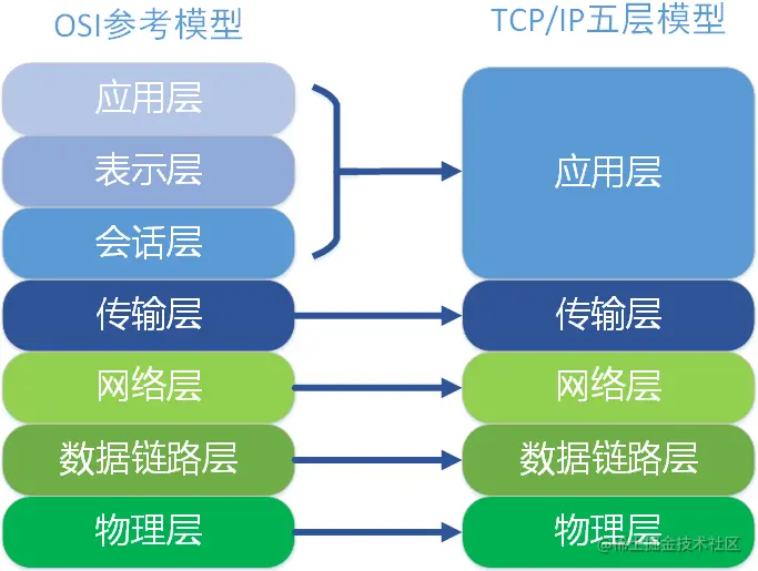 由于OSI模型比较复杂且学术化,日常实际使用过程中TCP/IP模型较多,分为5层,物理层、数据链路层(也有 TCP/IP 模型将物理层、数据链路层合称为网络接口层,与之对应的,协议就被称为 TCP/IP 四层协议模型)、网络层、传输层、应用层。