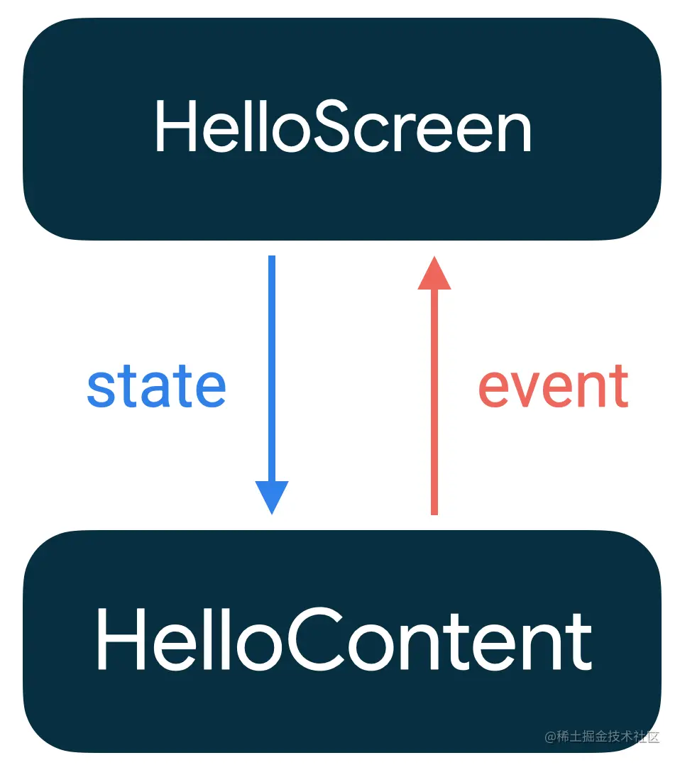 Compose 是 Android 版的现代 UI 开发库。其他的现代 UI 开发库(如 React)已经验证出一系列优秀的开发实践规则,这其中最受推崇的可能就是单向数据流模型了。官方也建议使用这一模型,这一模型可以分为俩部分:状态下沉(下图1),事件上升(下图2)。