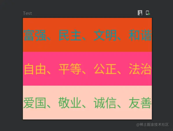 先介绍一下代码, Column 和 Row 这些是 Compose 组件库提供的布局容器,从名字可以看出前者是纵向布局,后者是横向布局,每个布局都有些独特的属性方便使用。像 for if when 也是可以使用的,这一点很大程度上增加了编程的效率。modifier 是每个组件都会有的属性。 该属性包含了所有组件的所有基础属性,常见的如宽高。值得注意的是,上面代码中,每一个的背景颜色也是跟参数对象中的值相关的!!!数据可以直接成为属性,或者说是状态,所以数据源的三条数据对应着图中的三行文字状态。