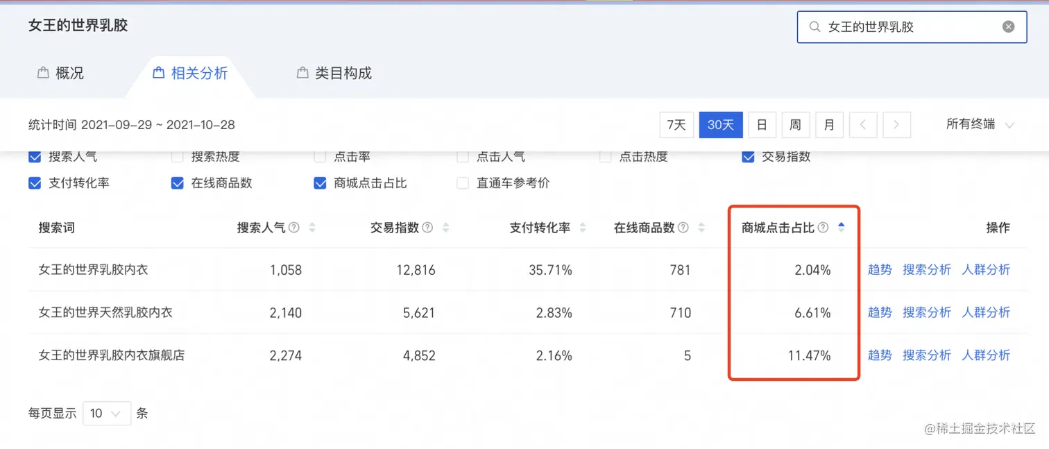 - 在生意参谋上输入某个关键词:比如「女王的世界乳胶」