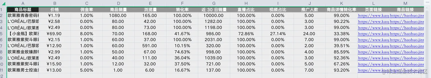如图,就是词根「欧莱雅」,输出的抖音蓝海品「欧莱雅蓝海品表格」:
