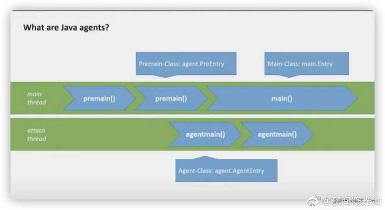 在加载Java Agent之后,会找到 Agent-Class 或者 Premain-Class 指定的类,并运行对应的 agentmain 或者 premain 方法。