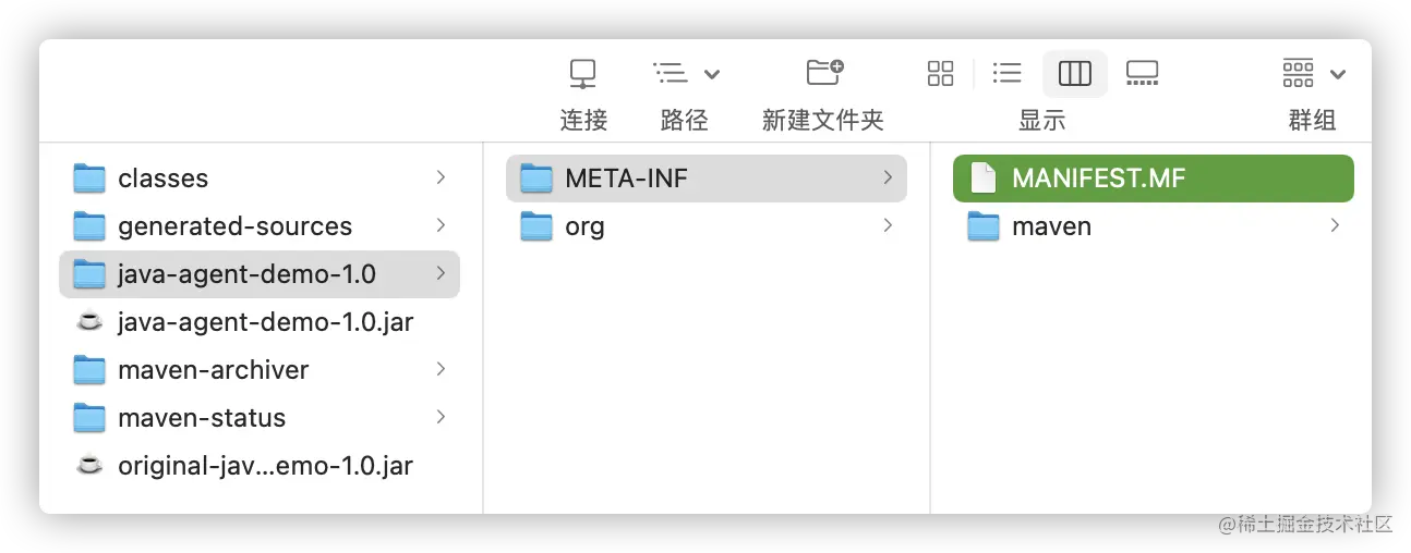 因为Java Agent的特殊性,需要一些特殊的配置,在 META-INF 目录下创建MANIFEST.MF 文件