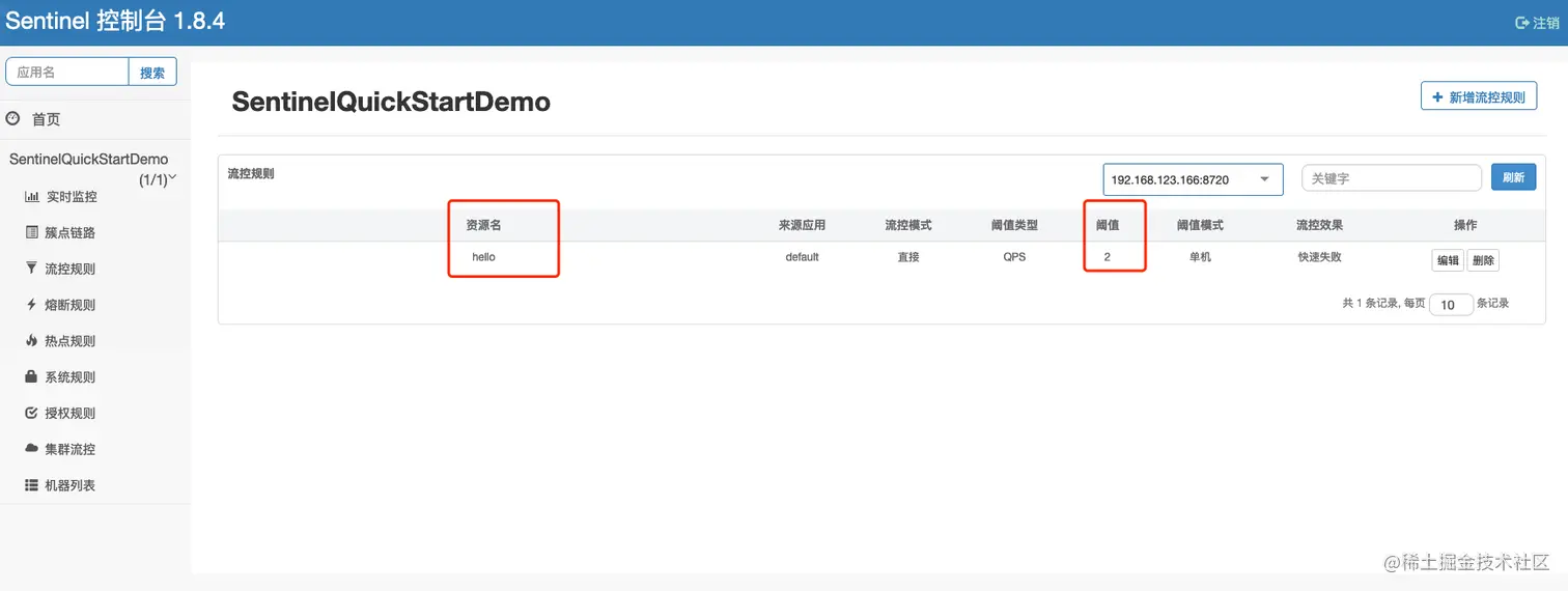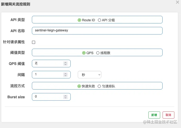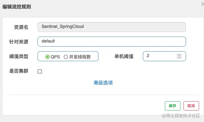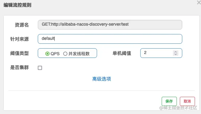 - 直接拒绝(RuleConstant.CONTROL_BRHAVIOR_DEFAULT)方式是默认的流量控制方式,当QPS超过任意规则的阈值后,新的请求被立即拒绝,拒绝方式为抛出