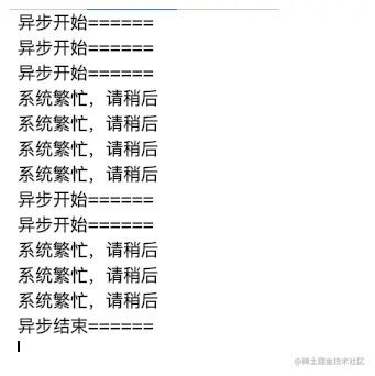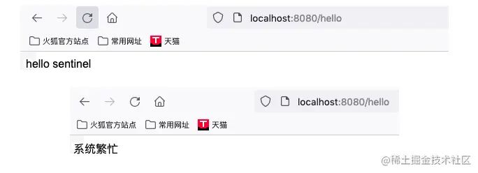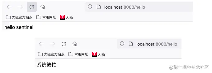 此时启动应用,访问资源hello,每秒慢速点击访问可以正常访问,如果快速点击出现系统繁忙,请稍后