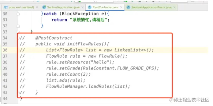 Sentinel中的SphU包含try-catch风格的api。用这种方式,当资源发生限流之后会抛出BlockException。这个时候可以捕捉异常,进行限流之后的逻辑处理,而我们在上面就使用了这种方式进行定义资源,关键代码如下: