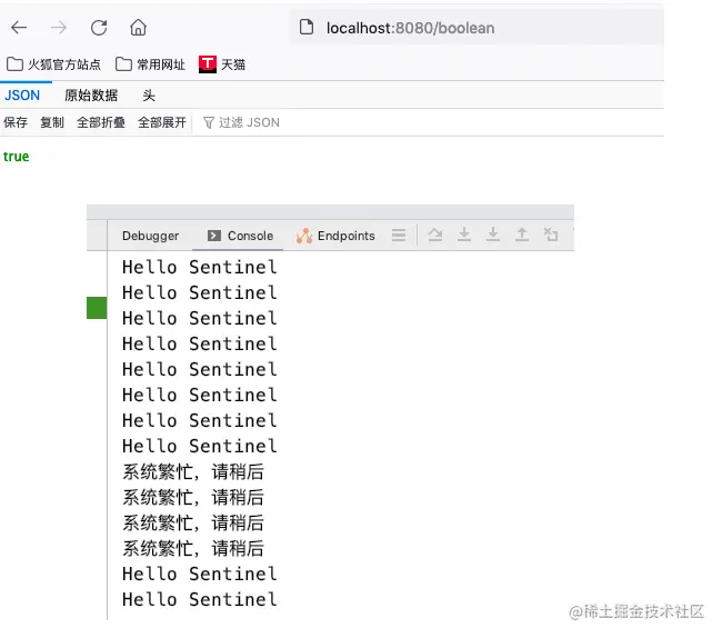 @RestController public class TestBooleanController { @GetMapping("/boolean") public boolean hello(){ if (SphO.entry("Sentinel_Boolean")){ try { System.out.println("Hello Sentinel"); return true; }finally { SphO.exit(); } }else{ // 限流降级的处理 System.out.println("系统繁忙,请稍后"); return false; } } } -