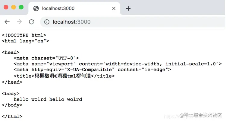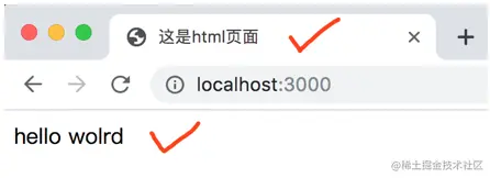 <!DOCTYPE html><html lang="en"><head><meta charset="UTF-8"><meta name="viewport" content="width=device-width, initial-scale=1.0"><meta http-equiv="X-UA-Compatible" content="ie=edge"><title>这是html页面</title></head><body>hello wolrd</body></html>