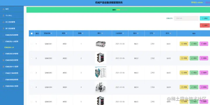 机械设备入库管理,在机械设备入库管理页面中可以查看索引、设备名称、类型、数量、图片、入库时间、备注、工号、姓名等信息,并可根据需要进行修改或删除等详细操作,如图4-6所示。
