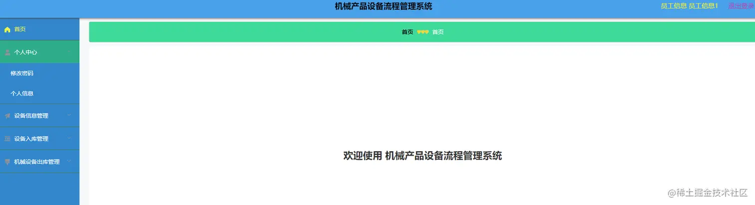 员工信息登录进入机械产品设备流程管理系统可以查看首页、个人中心、机械设备信息管理、机械设备入库管理、机械设备出库管理等内容,如图4-13所示。