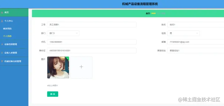 个人中心,在个人中心页面中通过填写工号、姓名、部门、性别、手机、邮箱、身份证、家庭住址、图片等信息进行修改,如图4-14所示。