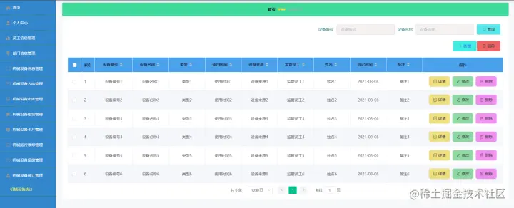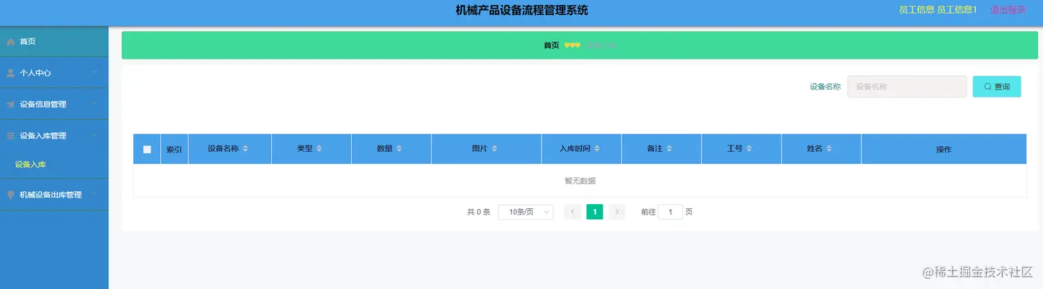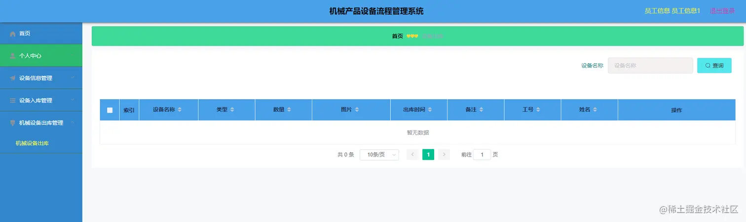 员工信息使用功能:首页、个人中心、机械设备信息管理、机械设备入库管理、机械设备出库管理等。