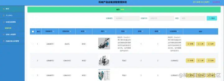 机械设备信息管理,在机械设备信息管理页面中可以查看索引、设备编号、设备名称、类型、图片、用途、价格、数量、注意事项等信息,并可根据需要进行入库、出库等详细操作,如图4-15所示。