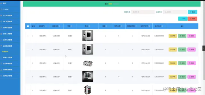 设备租凭管理,在设备租凭管理页面中可以查看索引、租凭单号、设备名称、类型、图片、数量、租用天数、租凭总价格、租用人姓名、联系电话等信息,并可根据需要进行修改或删除等详细操作,如图4-8所示。
