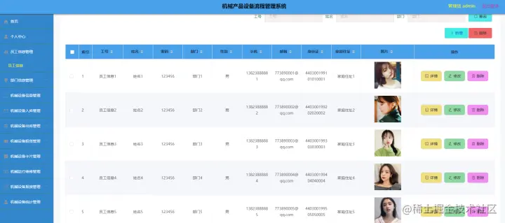 员工信息管理,在员工信息管理页面中可以查看索引、工号、姓名、密码、部门、性别、手机、邮箱、身份证、家庭住址、图片等信息,并可根据需要进行修改或删除等详细操作,如图4-3示。