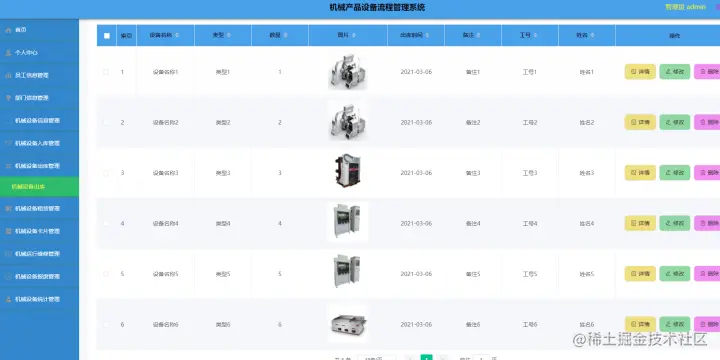 机械设备出库管理,在机械设备出库管理页面中可以查看索引、设备名称、类型、数量、图片、出库时间、备注、工号、姓名等信息,并可根据需要进行修改或删除等详细操作,如图4-7所示。