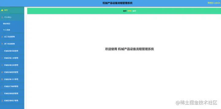 管理员登录进入机械产品设备流程管理网站可以查看首页、个人中心、员工信息管理、部门信息管理、机械设备信息管理、机械设备入库管理、机械设备出库管理、设备租凭管理、设备卡片管理、运行维修管理、设备报废管理、设备统计管理等信息,如图4-2示。