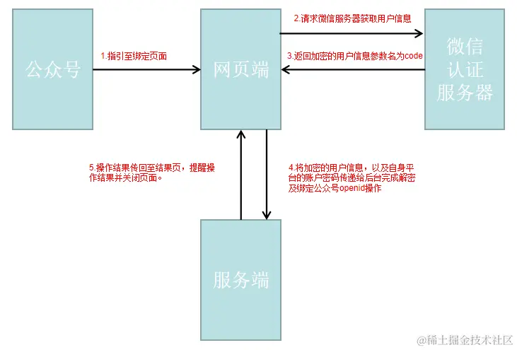 注意: *.2,3步为网页之间的跳转,需要先走微信认证服务器由微信服务器返回至网页,且不能携带参数,网页端通过参数中有没有code来判断是否完成了认证请求。 *.第4步中解密code携带的用户信息需要再服务端完成,需要访问微信服务器,携带的参数有公众号appid,开发者密码,在“微信公众平台-开发-基本配置”中获取。
