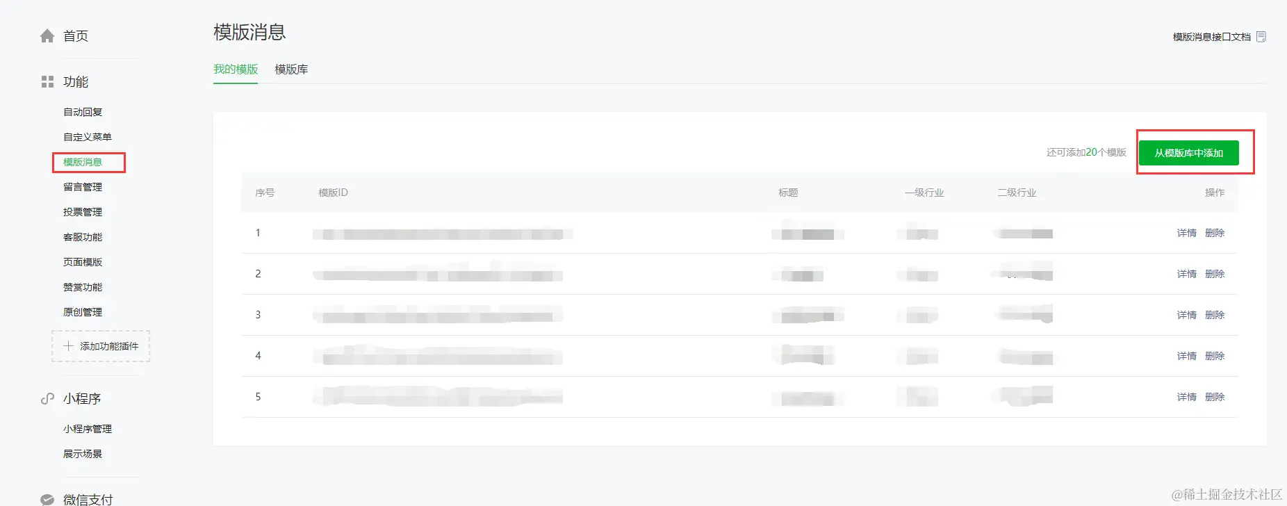 1.模板消息需要提前申请,入口在添加功能插件中,通过审批之后在功能-模板消息。需要注意的是行业决定了模板可以选择的范围,行业可以改但是需要时间。