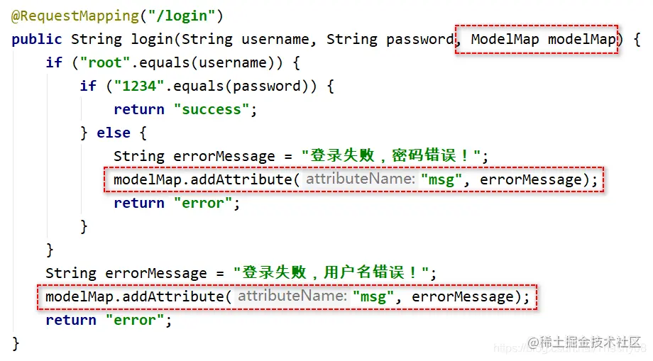 当控制器向模版页面转发时需要将数据交给模版页面去显示时,需要在处理请求的方法的参数列表中添 加 ModelMap 类型的参数,并在处理过程中,调用该参数对象的 addAttribute() 方法封装数据: