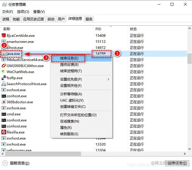 然后,在任务管理器中找到14788对应的进程(如果使用的是Windows 7操作系统,在任务管 理器的菜单中的“查看”菜单中“选择列”并勾选PID即可),将该进程直接终止即可: