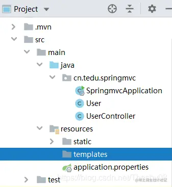 在SpringBoot中,当创建项目时勾选了 Spring Web 的依赖后,默认在 src/main/resources 下就已经 创建好了 templates 文件夹: