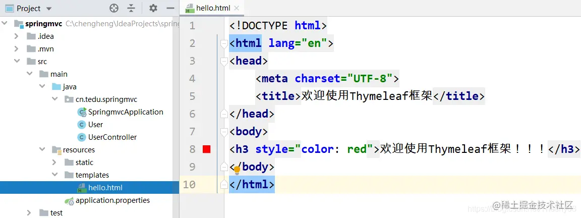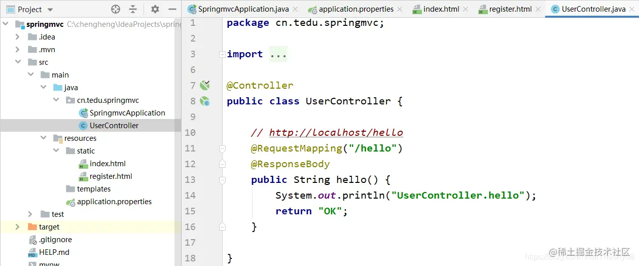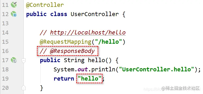然后,在 UserController 中,将原本的 hello() 方法上的 @ResponseBody 删除,并将返回值改为 hello :