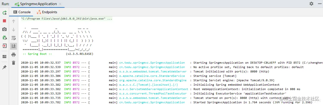 通过启动日志可以看到,启动当前项目时是启动了Tomcat的,并将项目部署在 8080 端口,这个 Tomcat是当前项目内置的!