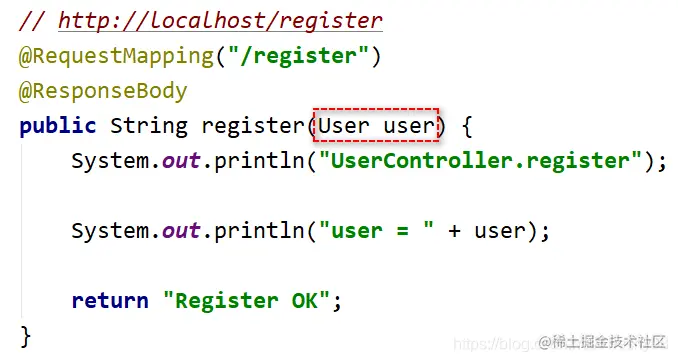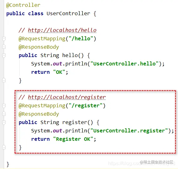 同一个控制器中可以有若干个处理请求的方法,例如此前练习的“用户注册”页面可以将请求路径设计 为 /register :