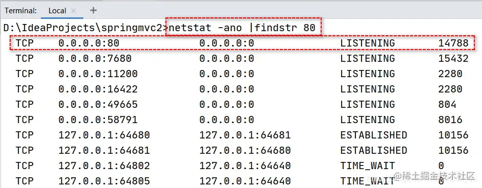 如果在终端或CMD窗口中根本不识别netstat命令,需要将C:\Windows\System32这个路径 配置到系统的环境变量PATH中,然后,重启IntelliJ IDEA或CMD窗口再执行!