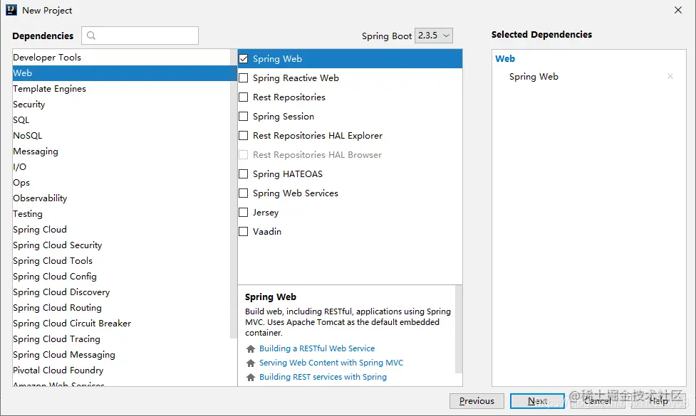 在选择依赖的界面,在左侧选择 Web ,在右侧勾选 Spring Web :