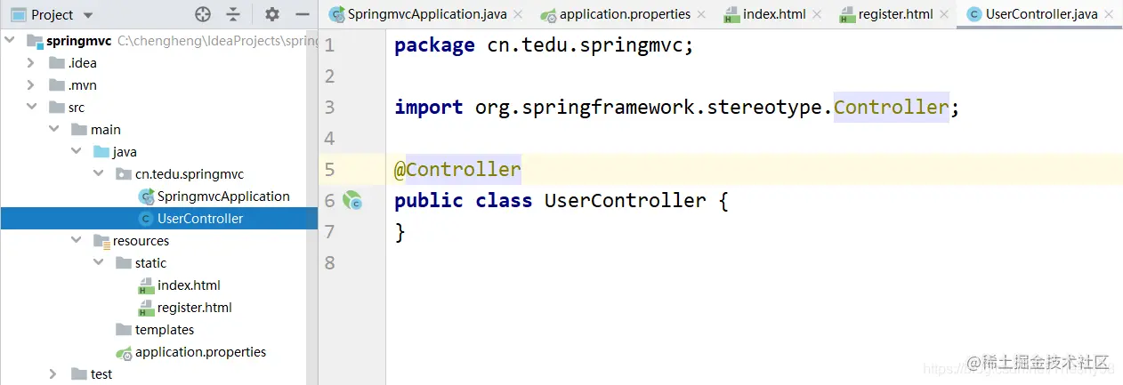 在传统Java EE项目中是使用Servlet组件(自定义类继承自 HttpServlet )作为控制器的,在 SpringMVC框架中可以自定义任何类作为控制器类,推荐使用 Controller 作为类名的最后一个单词, 并且在类的声明之前添加 @Controller 注解即可将该类配置为控制器类!例如,在 cn.tedu.springmvc 包中创建 UserController 类并添加 @Controller 注解: