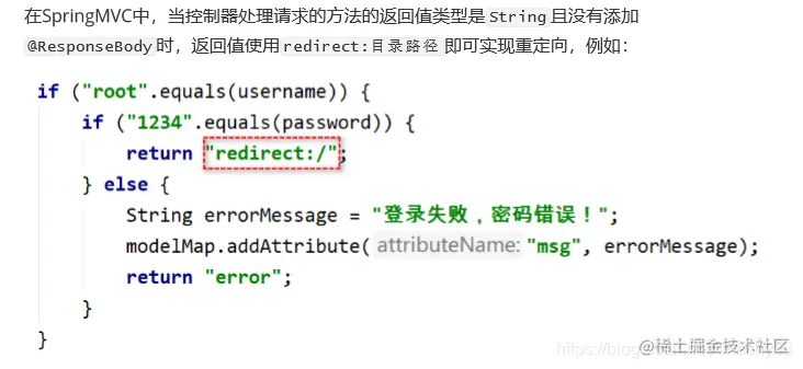 在SpringMVC中,当控制器处理请求的方法的返回值类型是 String 且没有添加 @ResponseBody 时, 返回值使用 redirect:目录路径 即可实现重定向,例如: