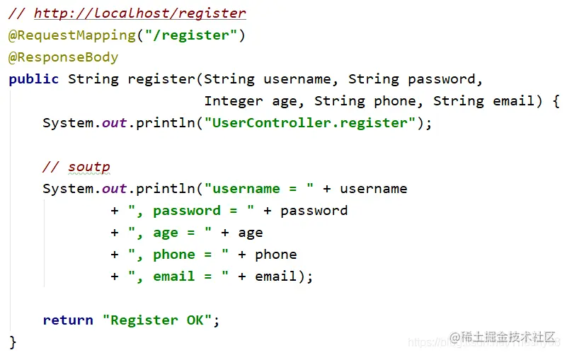 完成后,重启项目,在浏览器重新打开 http://localhost/register.html(如果已经打开,则需要刷 新),可以不必输入任何内容,直接点击提交按钮,在浏览器将可以看到 Register OK 字样,并且在 IntelliJ IDEA的控制台可以看到以上输出的内容!