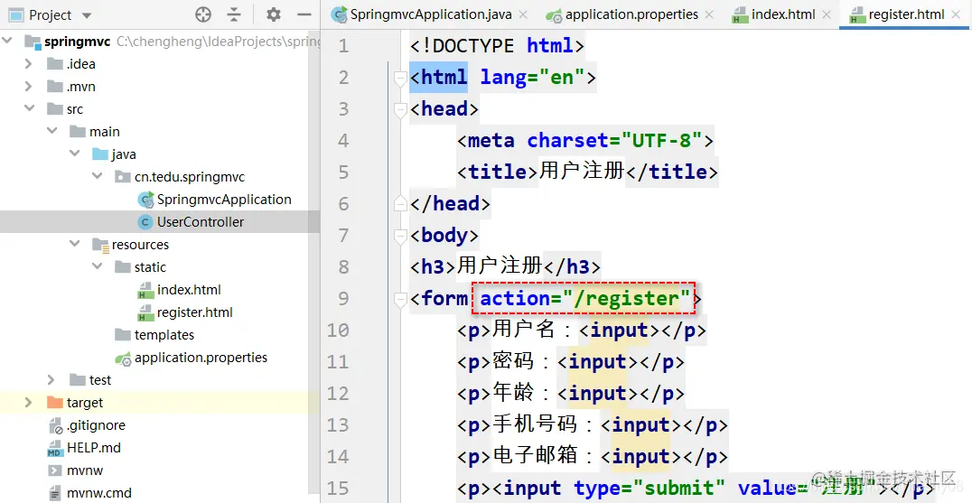 在 register.html 中,为表单中的各控件配置 name 属性就可以设置请求参数的名称,例如: