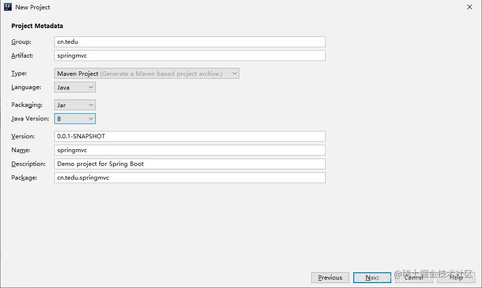 在接下来的界面中确定当前项目的一些参数,例如Group、Artifact、Java Version等: