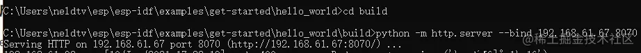 编译链内 Python 有一个内置的 HTTP 服务器,我们这里可以直接使用它。我们将会使用示例 get-started/hello_world 作为需要更新的固件。