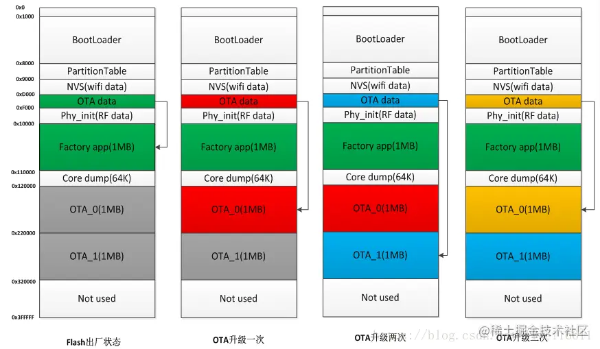 同理,若某次升级后 ESP32 已经在执行 OTA_0 内的固件,此时再升级时 OTA Demo 就会向 OTA_1 分区写入目标固件。再次启动后,执行 OTA_1 分区实现升级。以此类推,升级的目标固件始终在 OTA_0、OTA_1 两个分区之间交互烧录,不会影响到出厂时的 Factory App 固件。