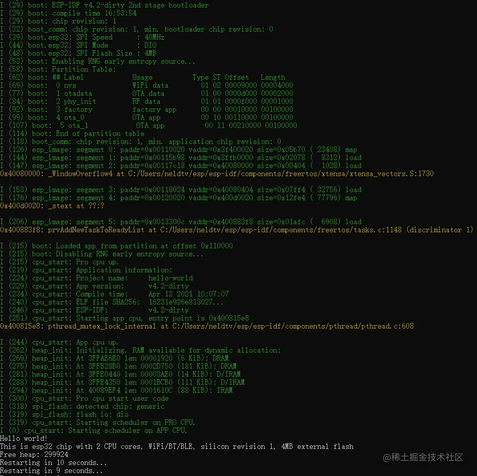 使用示例 get-started/hello_world,此处执行idf.py build 会生成二进制文件get-started\hello_world\build\hello-world.bin。