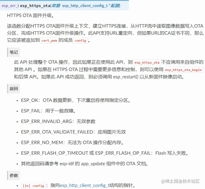 esp_https_ota组件提供的简化API,它在原生OTA API上添加了一个抽象层,以便使用HTTPS协议进行升级。分别在