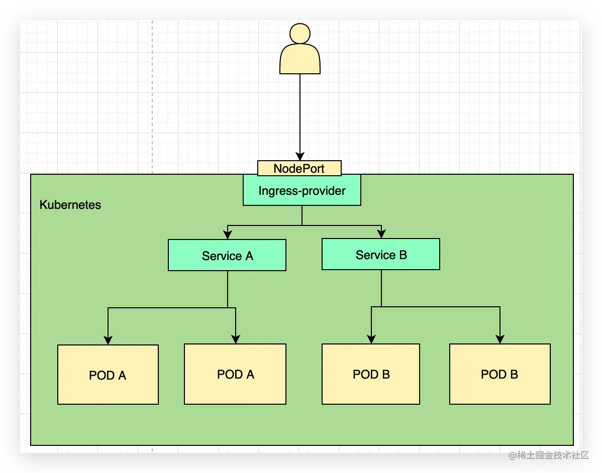 如下图所示在最前面有一个四层LB实现端口80/443转发至ingress-provider的service的NodePort,K8s集群内部配置有多个service。
