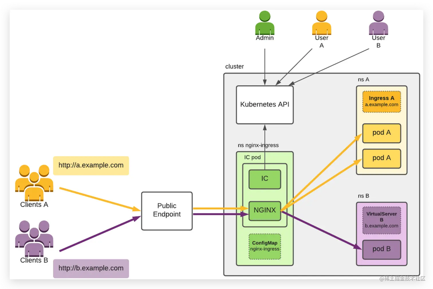 - 应用程序A由用户A在命名空间A中部署了两个吊舱。为了通过主机A.example.com向其客户机(客户机A)公开应用程序,用户A创建入口A。