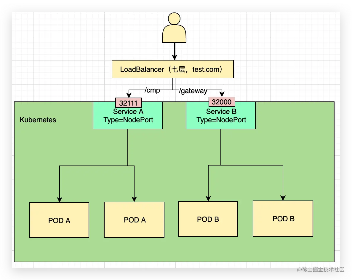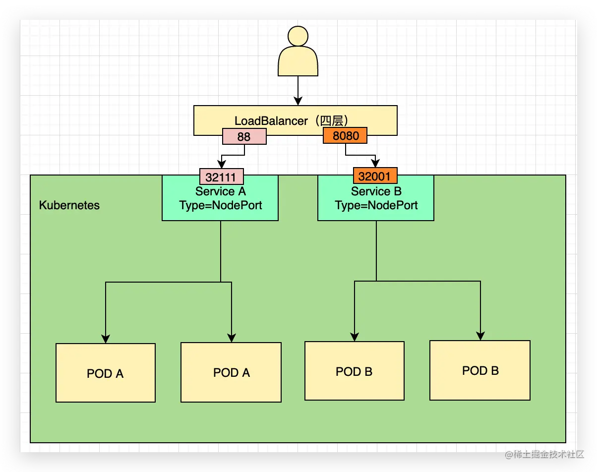四层流量转发一个LB的端口只能对应一个Service,Servcie的Type为NodePort,例如如下图,LoadBalancer上的88端口对应转发到后端NodePort的32111端口,对应到servcieA;LB上的8080端口对应转发到后端NodePort32001端口;该方案可以通过添加多个NodePort方式实现高可用,但是由于为四层无法实现对SSL的卸载,对应NodePort需要在LB占用一个端口。