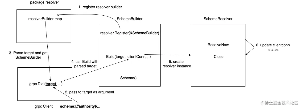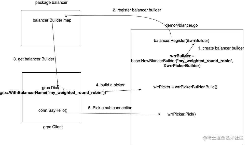 - grpc.Dial调用时传入一个WithBalancerName(“my_weighted_round_robin”),grpc通过balancer Name从已注册的balancer builder中选出我们实现的wrrBuilder,并调用wrrBuilder创建Picker:wrrPicker。